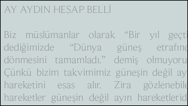 Biz insanoğluna Allah’ın bildirdiği takvim ay takvimi yani hicrî takvimimizdir. Allah katındaki takvim biz Müslümanların takvimidir. Biz ancak bu takvime göre yaşamak suretiyle kaderine duhul edenlerden oluruz.