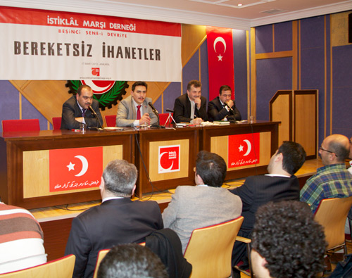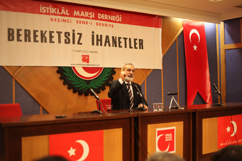 İstiklâl Marşı Derneği'nin beşinci sene-i devriyesi münasebetiyle tertip ettiği “Bereketsiz İhanetler" başlıklı panel ve konferans 17 Mart 2012 tarihinde Ankara’da yapıldı. Yoğun ilgi gören panelde ilk olarak söz alan İstanbul Şube Başkanı Sedat Akyüz, insanların bulundukları yeri bilmeden, bir sabiteyi esas almadan dünyada olup bitenleri anlamakta yetersiz kalacaklarını izah etti. Bu bakımdan İstiklâl Marşı’nın İslami mücahedenin mihveri olduğu tespitinde bulunan Akyüz, İstiklâl Marşı’nın niçin yazıldığı, Türkiye’nin niçin bir vatan olduğu ve nihayetinde İstiklâl Marşı Derneği’nin niçin kurulduğu hususları dikkate alınmadan Kur’an-ı Kerim’den ve Hadis-i Şeriflerden bir şey anlaşılamayacağını belirtti. Sedat Akyüz konuşmasında Harf İnkılâbı olarak bilinen hadiseyle yazımızın elimizden alınmasının bir ihanet olması kadar bu yazıyı tekrar elde etme çabası göstermemenin bir başka ihanet manası taşıdığını ifade etti. Kötü bir duruma rıza göstermenin bir ihanet olduğunu, kötü durumu meydana getirenlerle ona rıza gösterenler arasındaki danışıklı halin ihanetin cesamet kazanmasına hizmet ettiğini belirten Akyüz, bu bakımdan karşılıklı bir ilişkinin olmadığı yerde ihanetin etkisiz kalacağından söz etti.