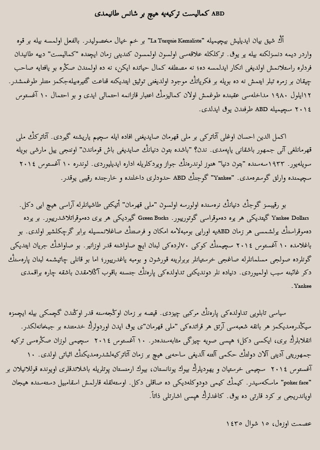 Amerikalı olmak için zahmete girmeye gerek yok. Tarihte zahmet yükünü çekemeyenler Amerikalı oldu. Günümüz şartlarında Amerikalı olmakla, olmak istemekle zahmetsiz galibiyet, istemek müterâdiftir. Türk olmak hak edilmiş bir galibiyeti müdafaa ile mümkündür.