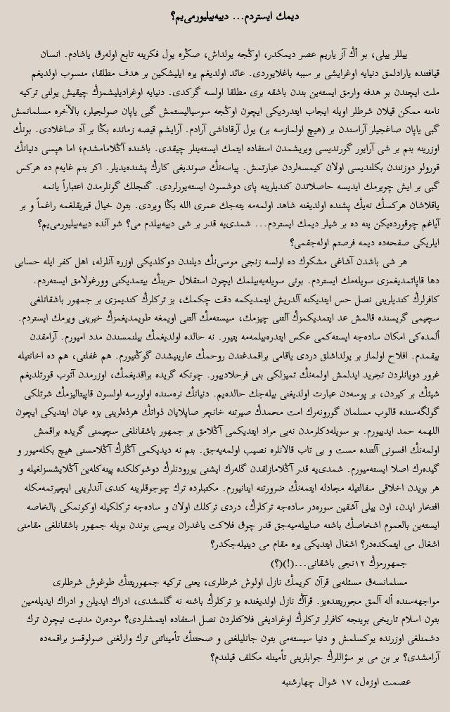 Türkiye’nin istikbali için hayırlı bir iş yapılacaksa işe önce lisanımızdan başlanılmalıdır. Lisanımız olan Türkçe, bir kavmin değil -bir İslam dili olarak- Türk Milletinin dilidir. Müslüman olmadan Türk olunamayacağı gibi Türkçe de konuşulamaz.