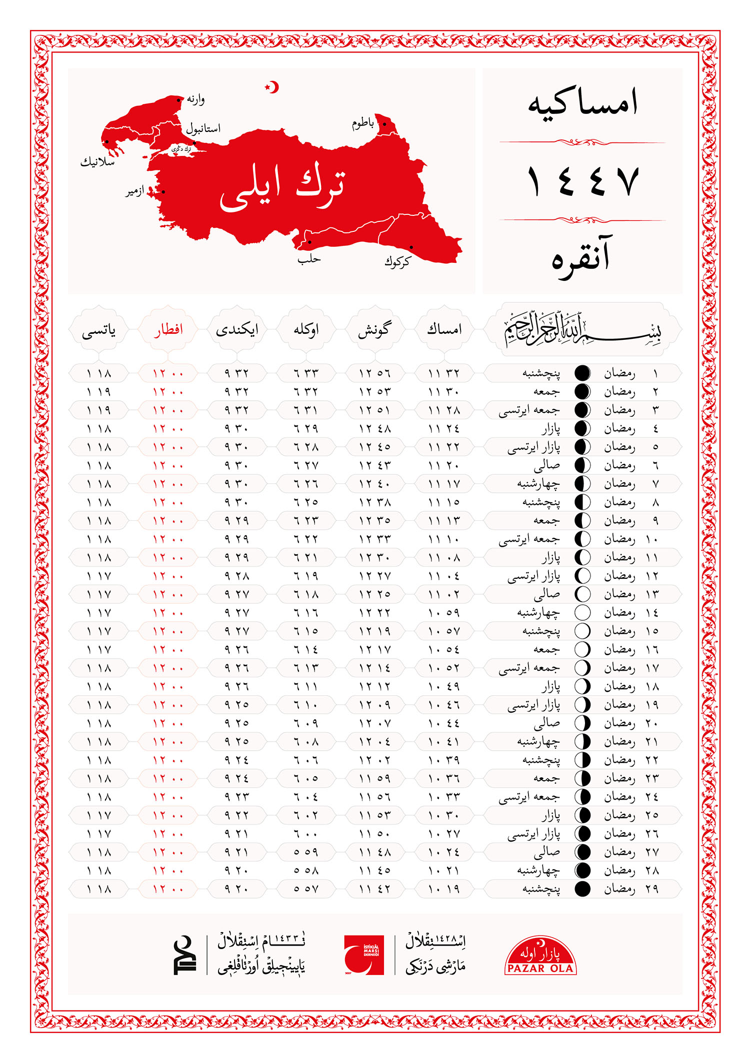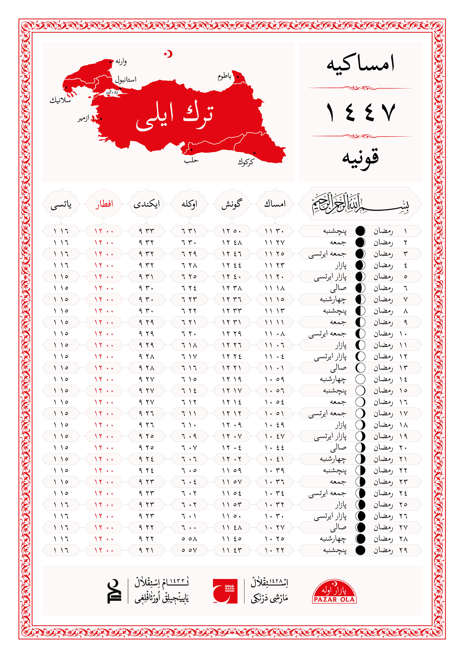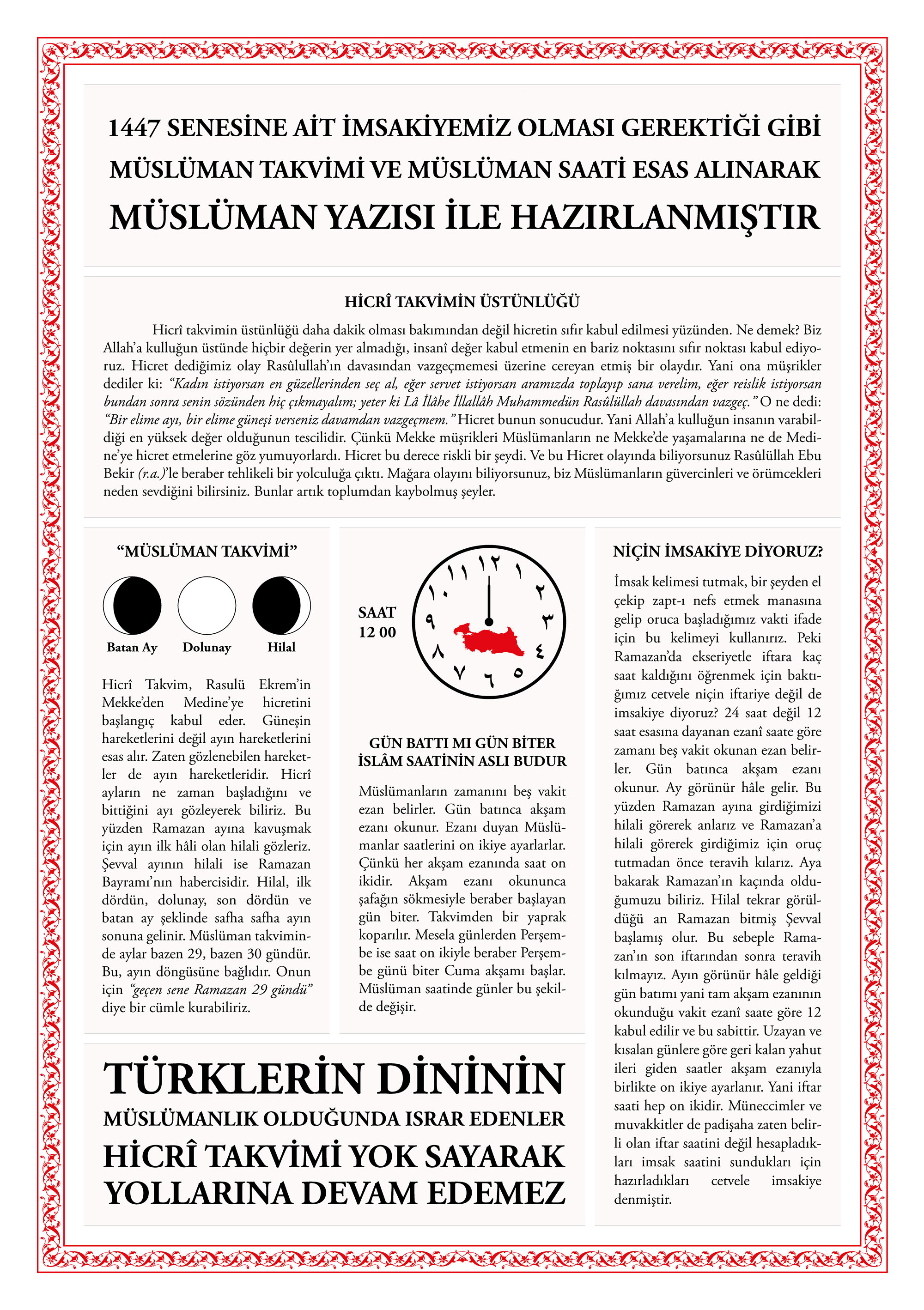 Ayın görünür hale geldiği gün batımı yani tam akşam ezanının okunduğu vakit ezanî saate göre 12 kabul edilir ve bu sabittir. Uzayan ve kısalan günlere göre geri kalan yahut ileri giden saatler akşam ezanıyla birlikte 12'ye ayarlanır. Yani iftar saati hep 12'dir. Müneccimler ve muvakkitler de padişaha zaten belirli olan iftar saatini değil hesapladıkları imsak saatini sundukları için hazırladıkları cetvele imsakiye denmiştir.